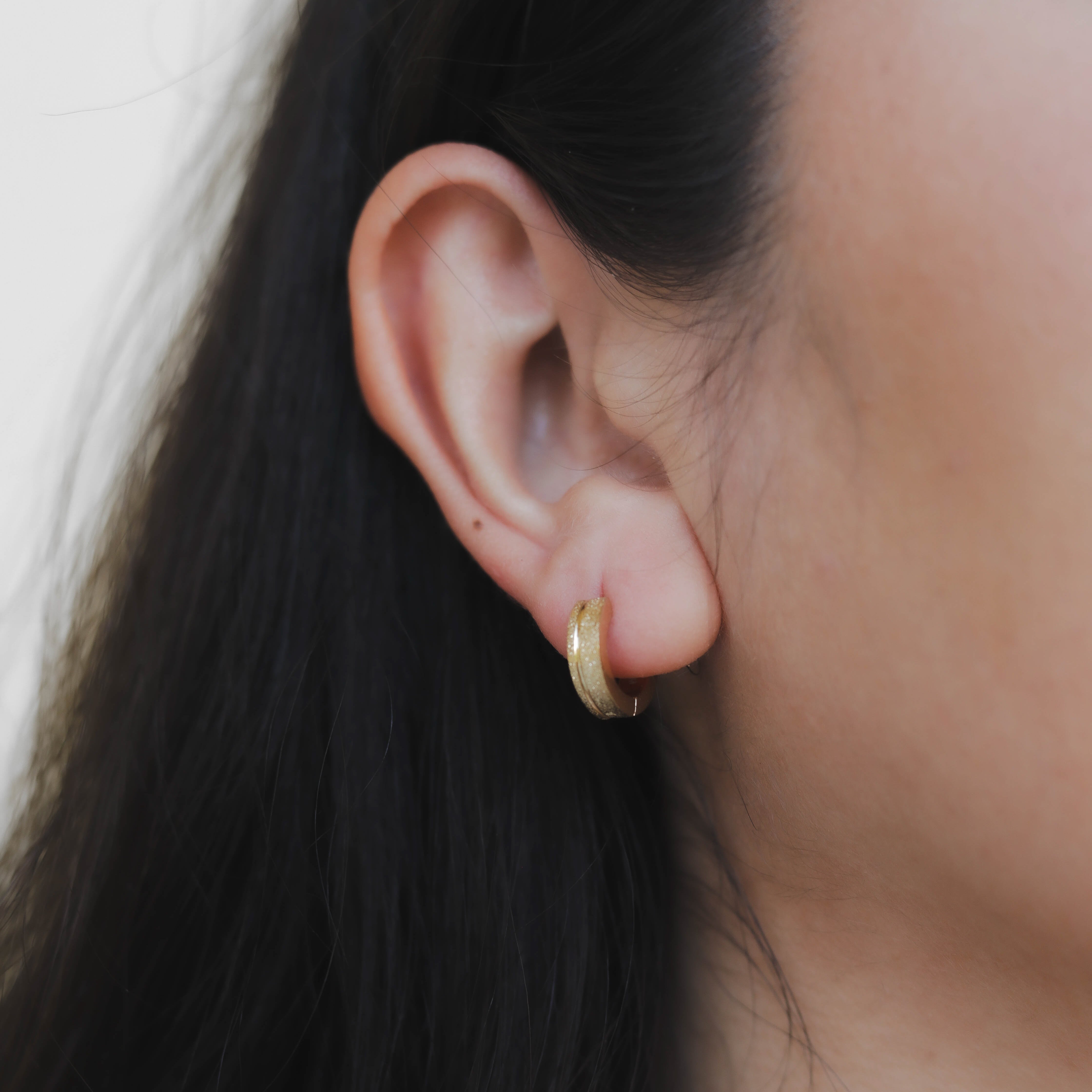 The Stardust Huggies feature a unique, sandblasted texture that glitters and catches the light. Designed for everyday comfort, they offer a sophisticated alternative to a classic polished hoop, perfect for adding a touch of understated glamour to your look.